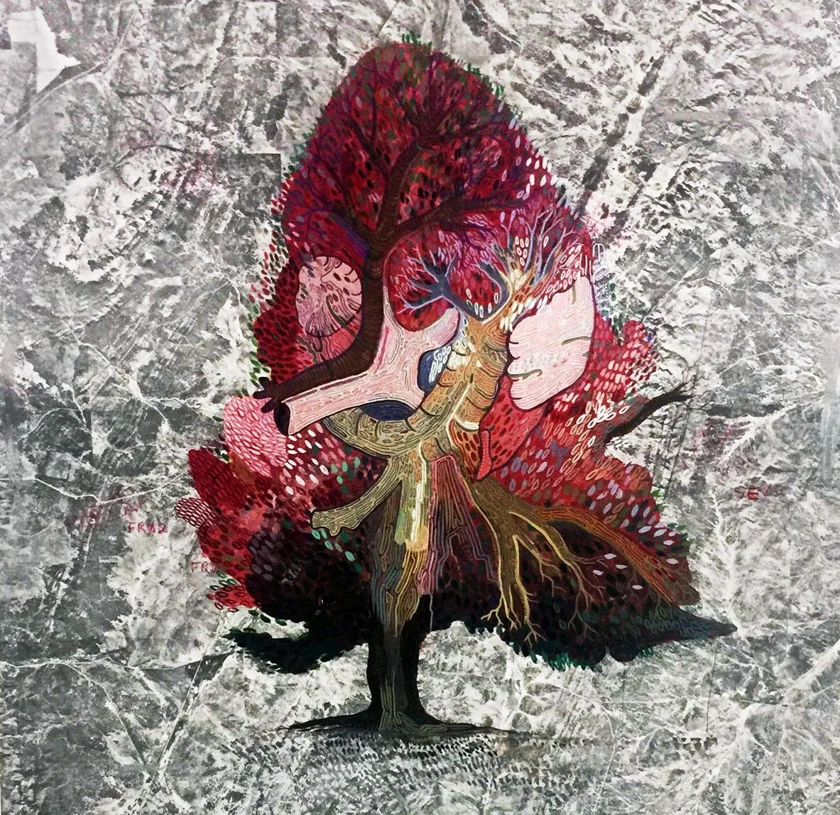 “These works were created as part of an artist in residency at Flinders Medical Centre in 2019. Inspired by the book The Night Life of Trees by Bhajju Shyam, Durga Bai and Ram Singh Urveti I have created eight tree portraits. My portraits reference certain properties of the trees I was inspired by.